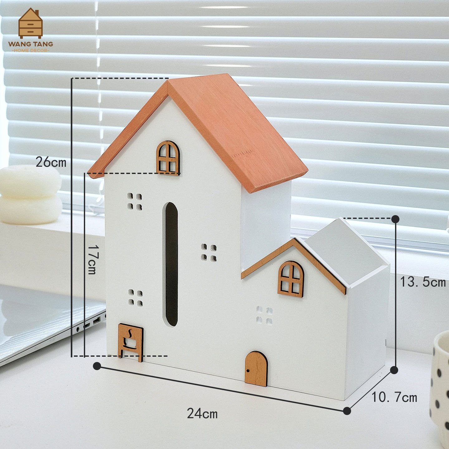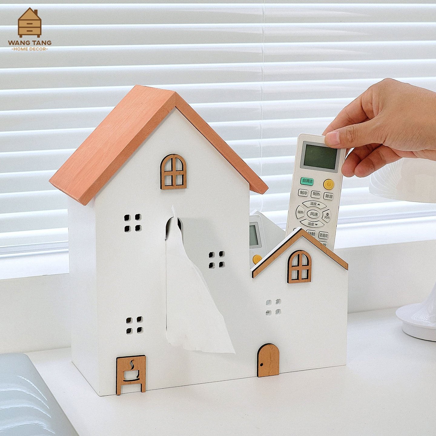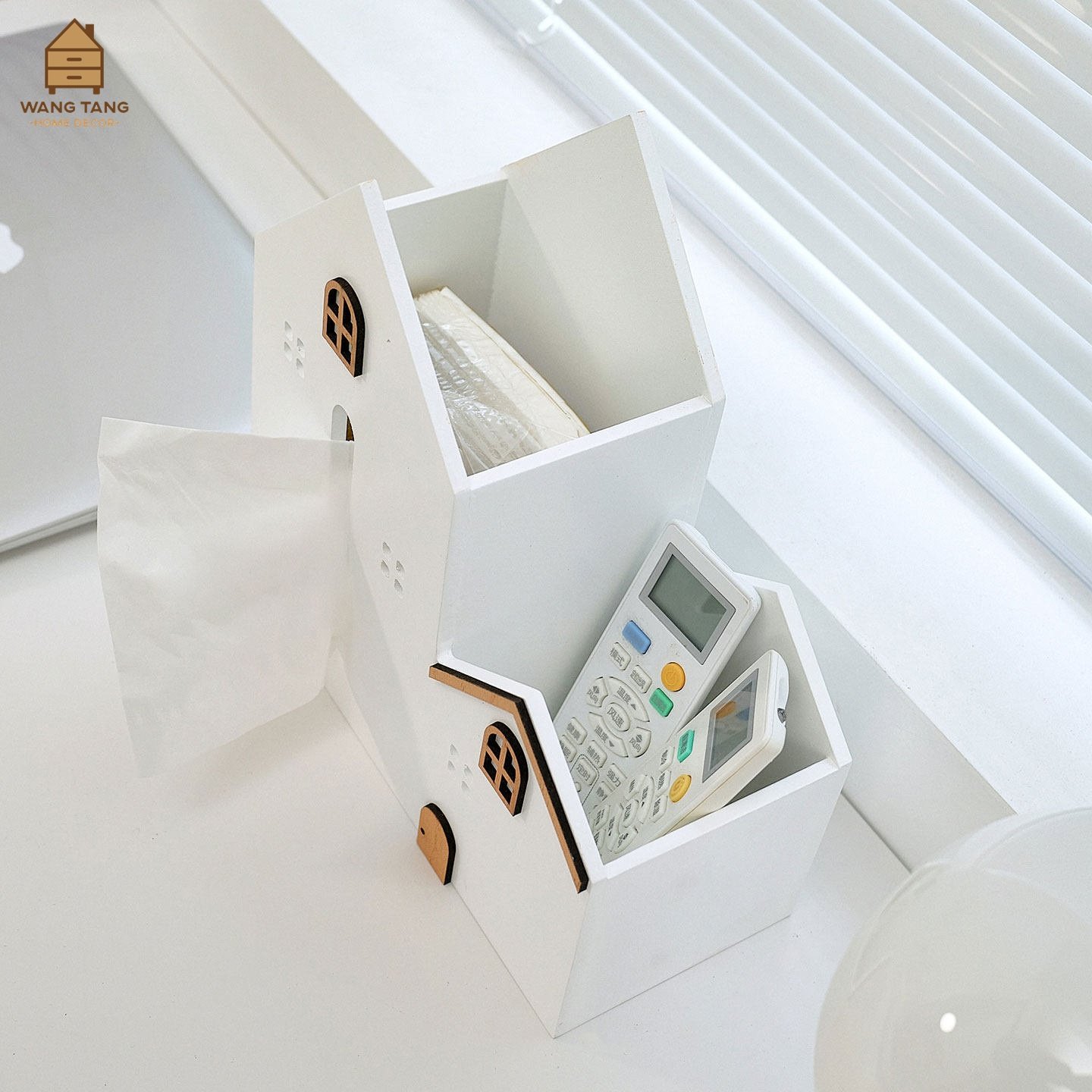 ดีไซน์แบบ 2 in 1: เป็นทั้งกล่องใส่กระดาษทิชชู่ (บ้านหลังใหญ่) และช่องเก็บของอเนกประสงค์/ที่เก็บรีโมท (บ้านหลังเล็ก) ในชิ้นเดียว